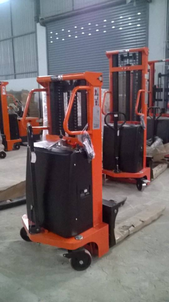 Xe nâng bán tự động 1.5 tấn hoạt động theo cơ chế nâng hạ bằng điện di chuyển kéo đẩy tay.