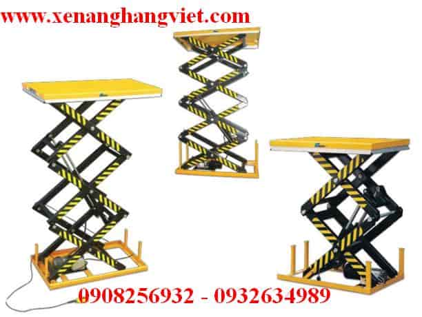 Bàn nâng thủy lực điện 1000kg cao 3m HT1000 1 tấn có 3 cắt kéo nâng lên cao, bộ điều khiển bằng tay cầm hoặc bằng chân điều khiển